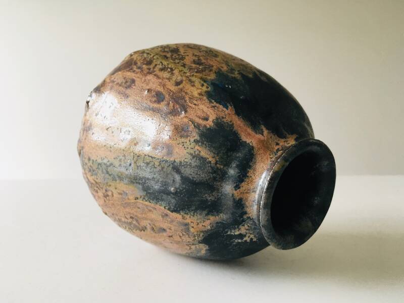 To collect Edgard Aubry is to collect a universe: the opulence of colour and texture in his glazes makes every piece a fascinating landscape – his greens now moss and pine, then watery iridescent; a whole range of earth tones; the yellow of desert sand and the brown-orange of rust and amber; all sorts of pebble and slate gray; the dark blue of night skies and deep water; and then that fascinating tinge of pink … His pieces do not have that smooth commercial perfection seen in some Guerin items. They are the characteristic produce of Edgard Aubry’s uncompromising artistry.