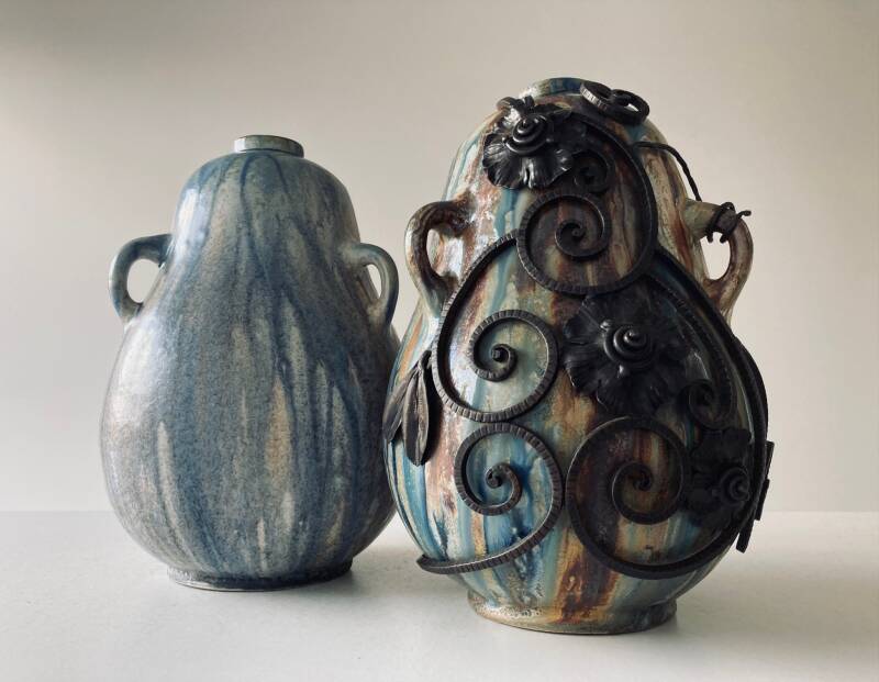 Stunning pear-shaped vases by Roger Guérin, one with forged frame by François Carion (°1884) (30 cm), signed with shape number 163/c and "Grès Guérin", and on a leaf of the frame "FCarion".