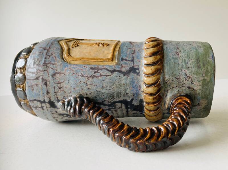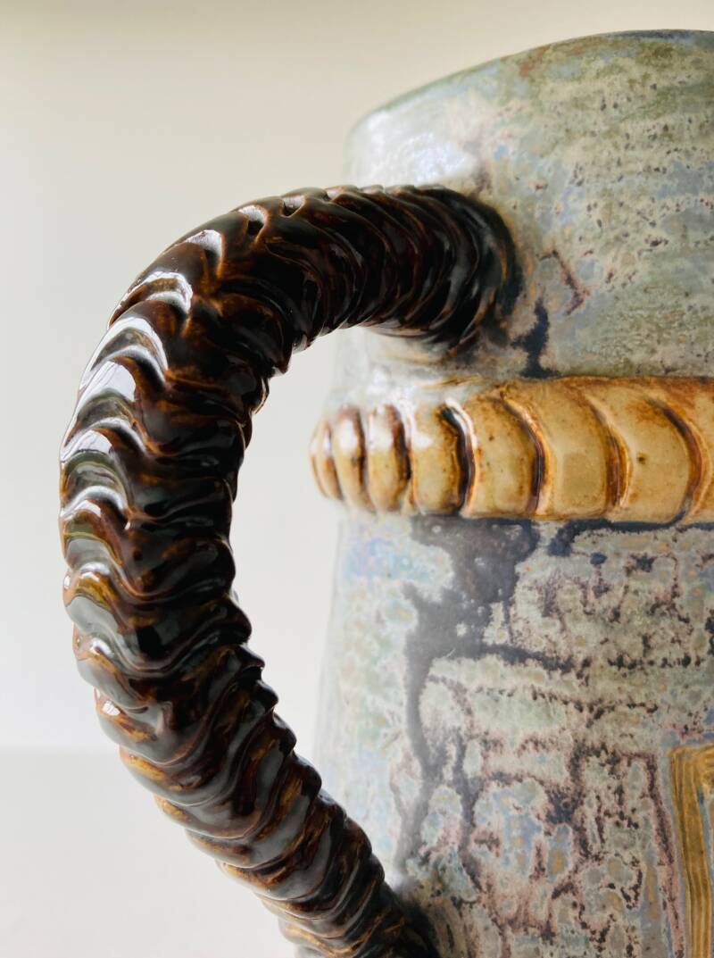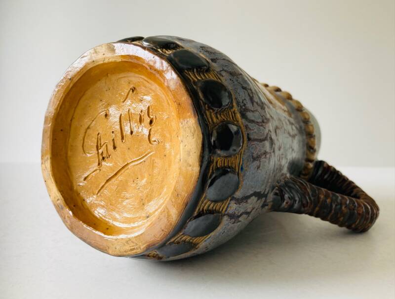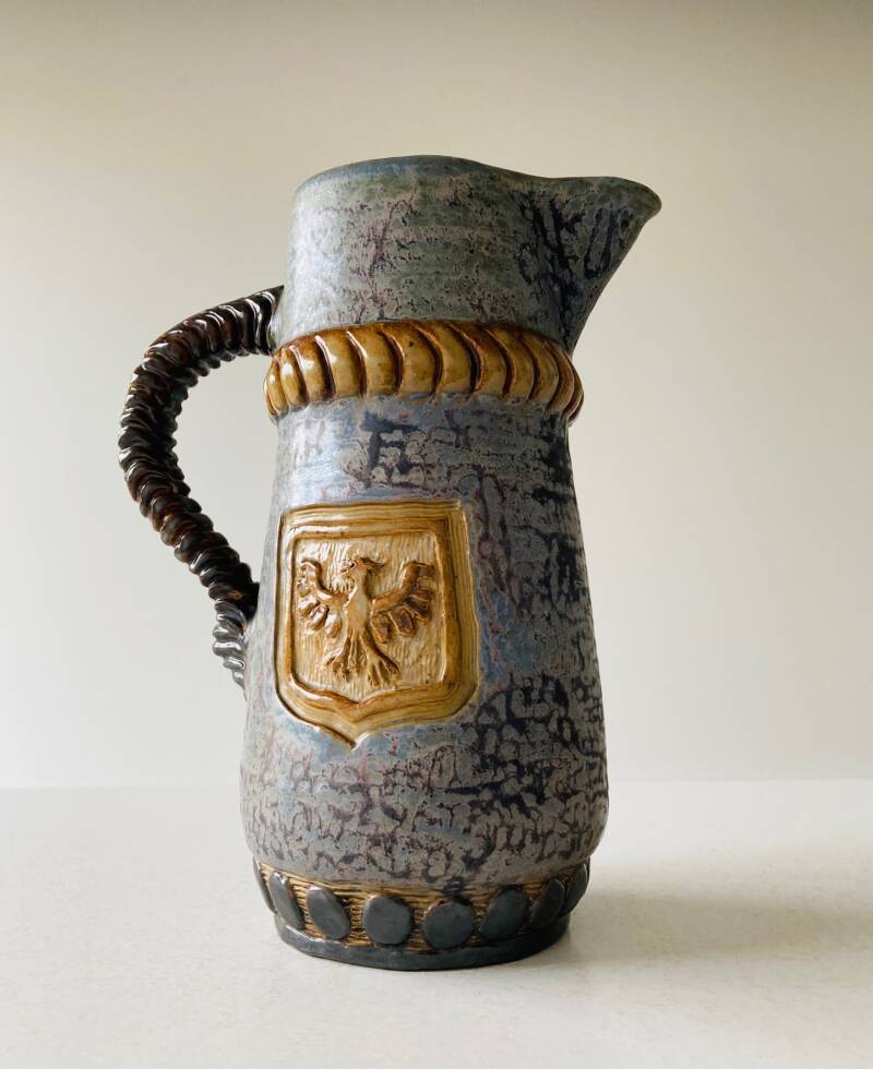Jug in matt-blue glaze with shields on both sides, a striking ribbed handle and decorative bands, signed at the bottom "A. Gilles".