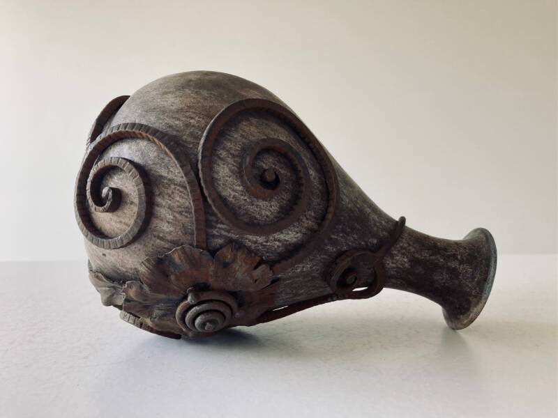 Rare vase by Carlos Delsaux with wrought iron decoration by François Carion (°1884), with signature 'FCarion' on a leaf and signed at the bottom 'C. Delsaux'.
