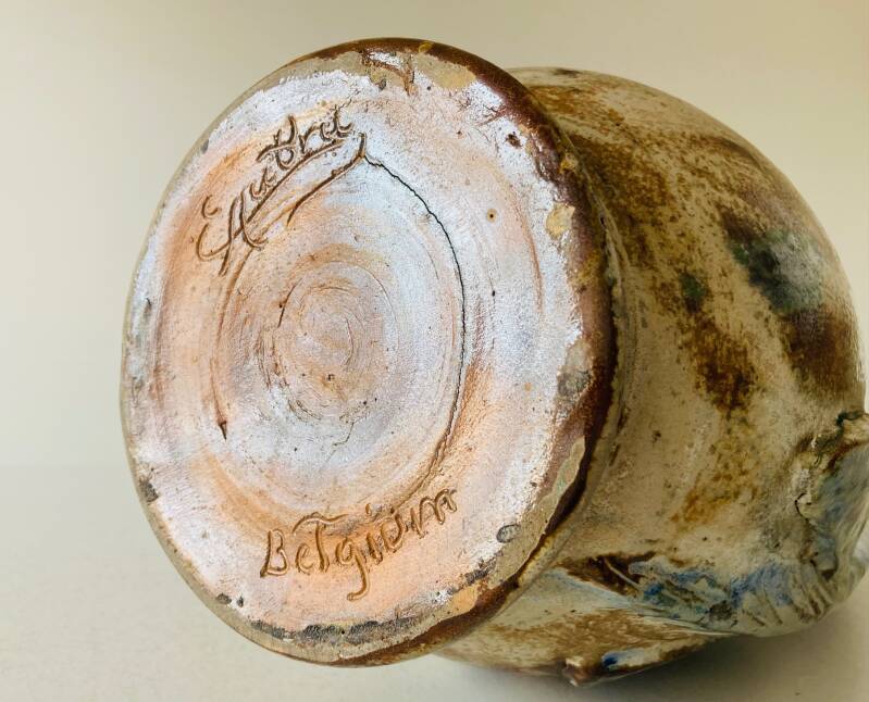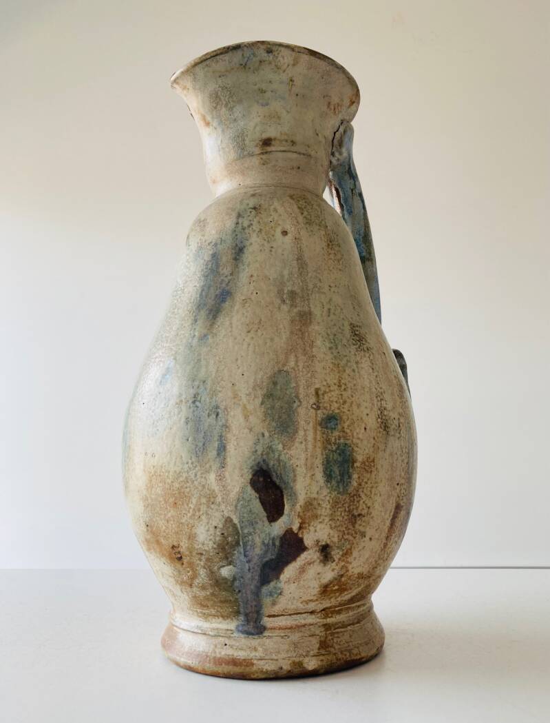 Impressive matte-white floor vase (45 cm h.) with a striking blue handle in the shape of a tail with spread wings (or elephant ears?) on the sides, signed E. Aubry Belgium ('30s-'40s).