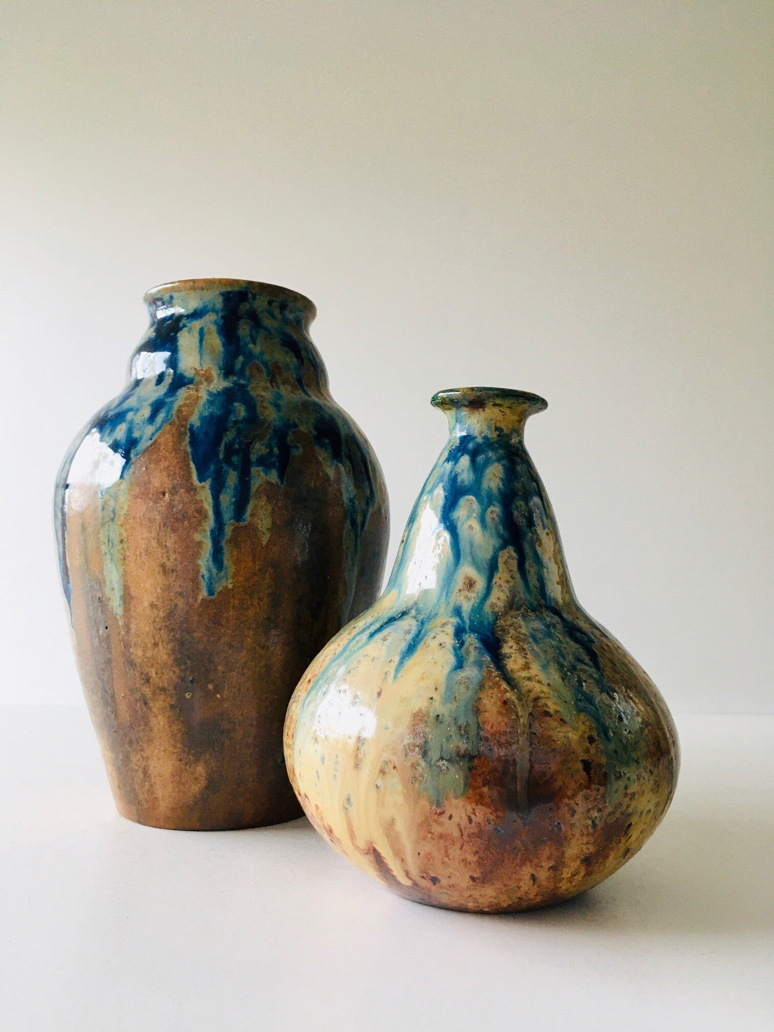 To collect Edgard Aubry is to collect a universe: the opulence of colour and texture in his glazes makes every piece a fascinating landscape – his greens now moss and pine, then watery iridescent; a whole range of earth tones; the yellow of desert sand and the brown-orange of rust and amber; all sorts of pebble and slate gray; the dark blue of night skies and deep water; and then that fascinating tinge of pink … His pieces do not have that smooth commercial perfection seen in some Guerin items. They are the characteristic produce of Edgard Aubry’s uncompromising artistry.