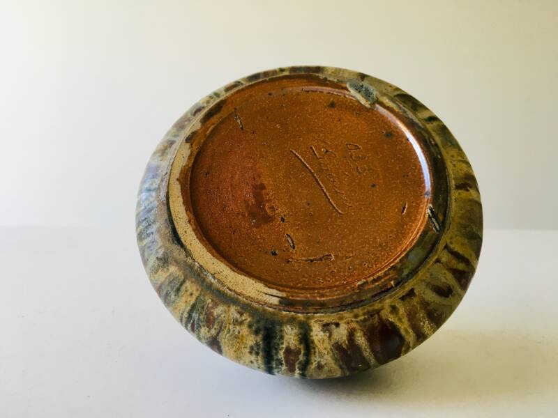Two wide flat vases (shape numbers 033 and 195c, 10.5 and 13.5 cm h.), one beautifully veined in earth tones, the other with subtle gray-green-blue crystal glaze.