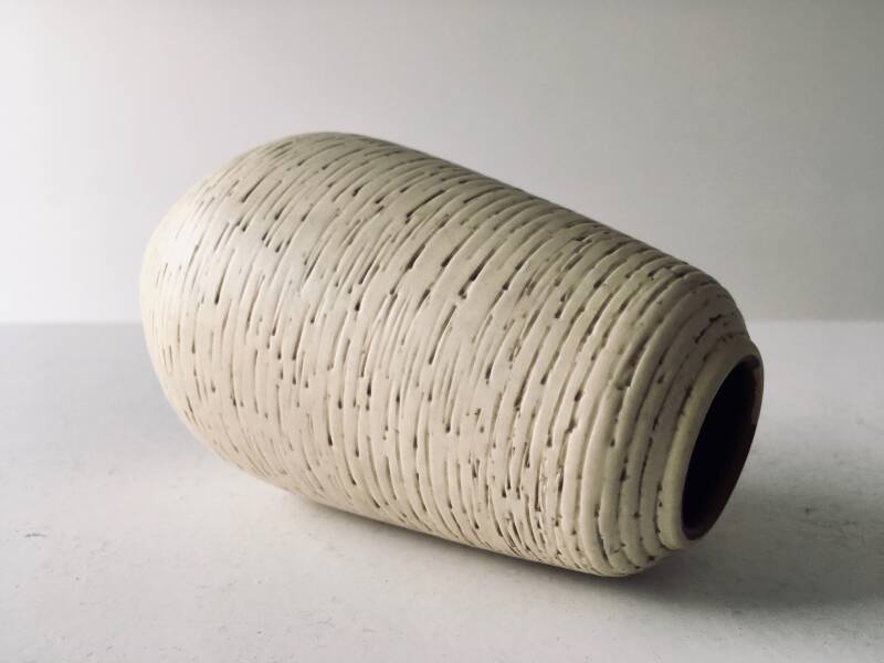 Some vases are special, and these Ü-Keramik 417/15 and /25 are such vases: the shape was launched in 1955 already, and it was in the collections of 1957 and 1958 (cf. H. Makus). I love their delicately curved, almost organic shape and their matte off-white and subtly structured glaze. They are just perfect, especially together.