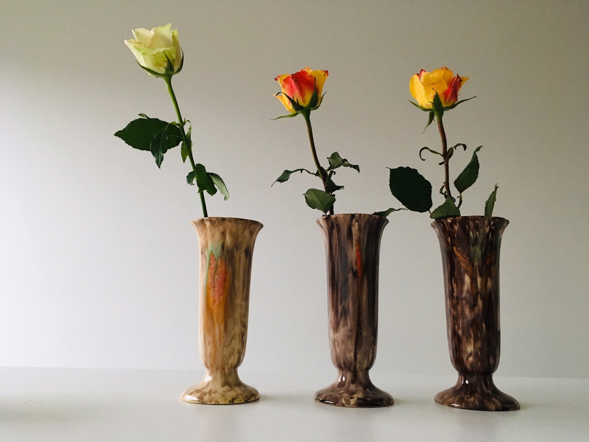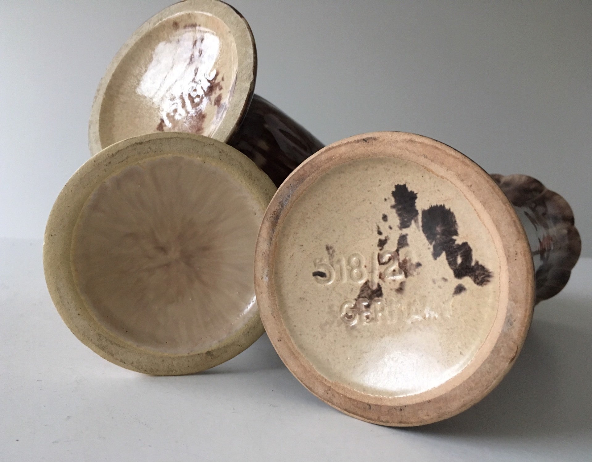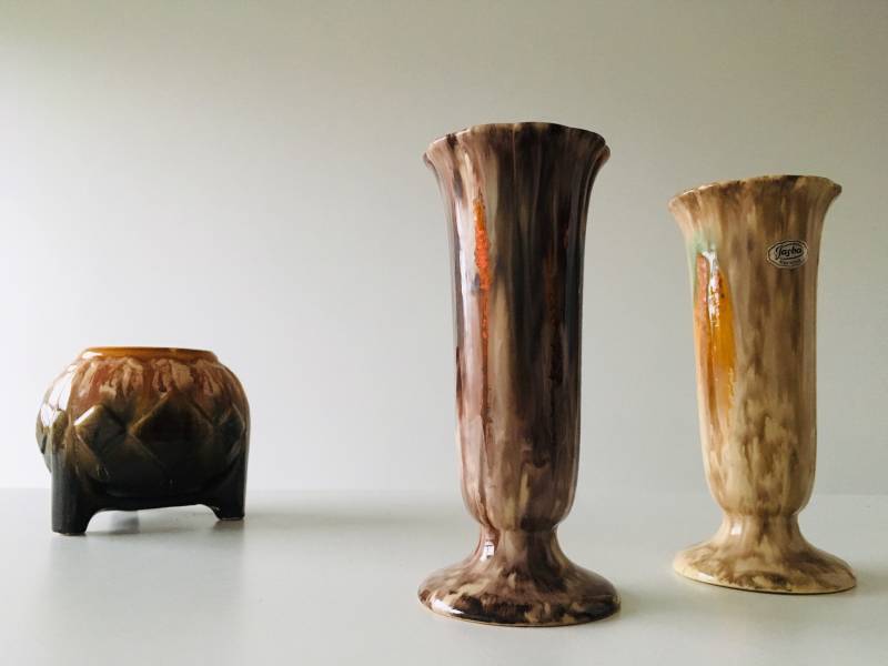 The old Jasba drip glazes are truly underestimated. Just look at these tubular vases, shape 518-21: they are just fabulous, with their smooth, slightly weird organic look, and their touch of mint-green and uranium orange.