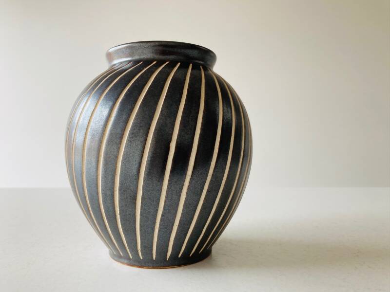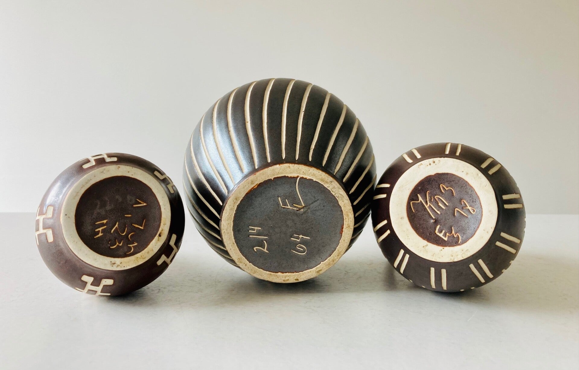 The black-brown sgraffito vases by Piesche & Reif are very sought after by collectors. The various white sgraffito motives contrast nicely with the dark glaze. Three nice examples, 19 and 15 cm high.