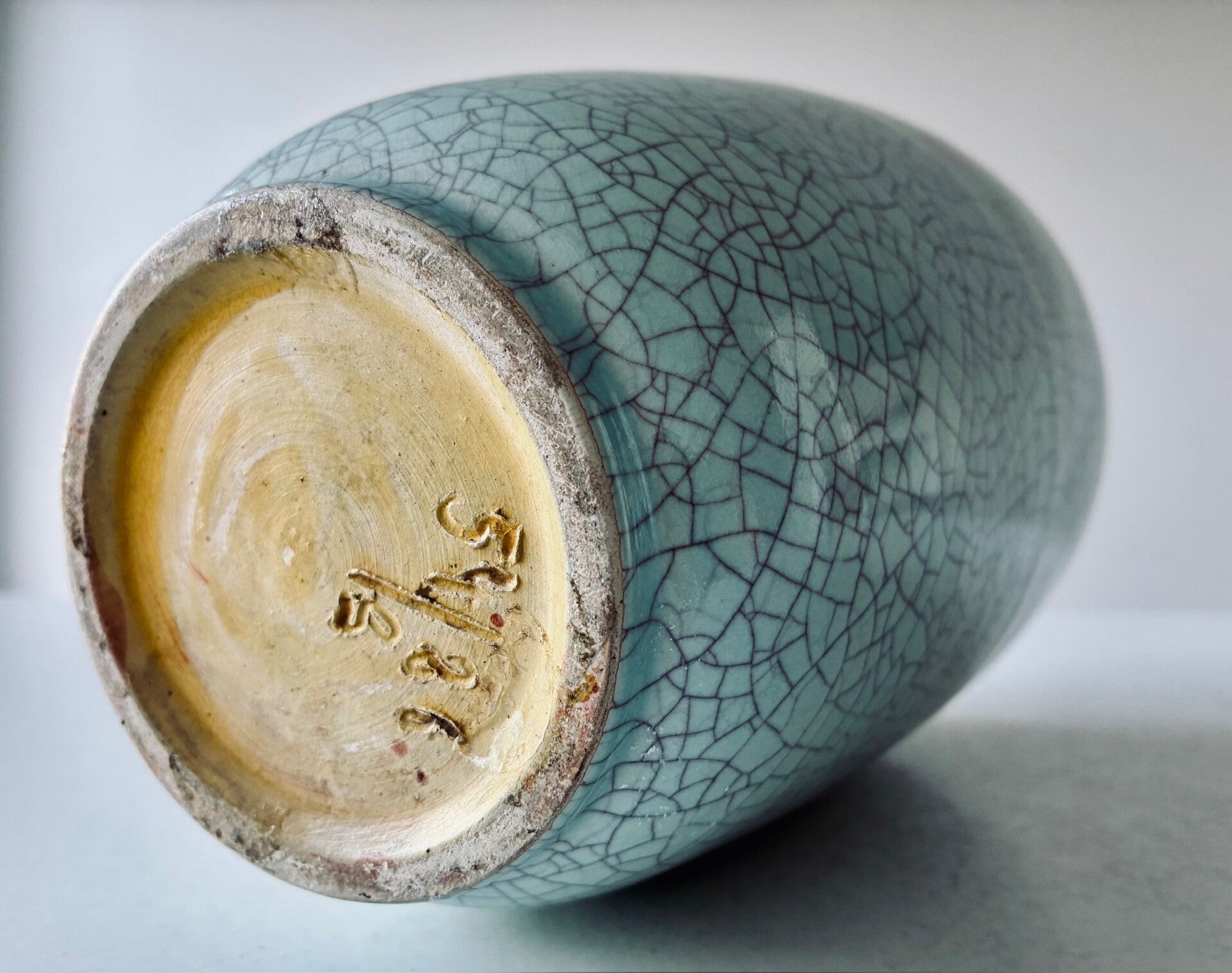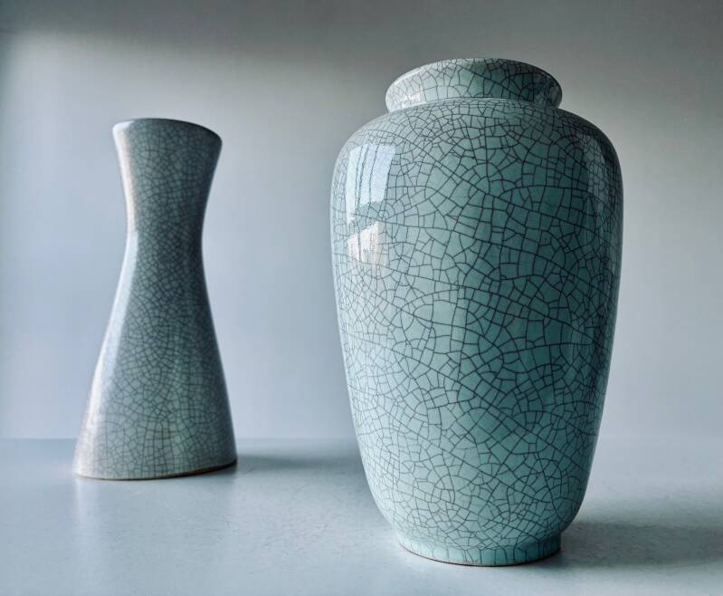 26 cm high celadon coloured craquelé vase, manually signed 54/26.