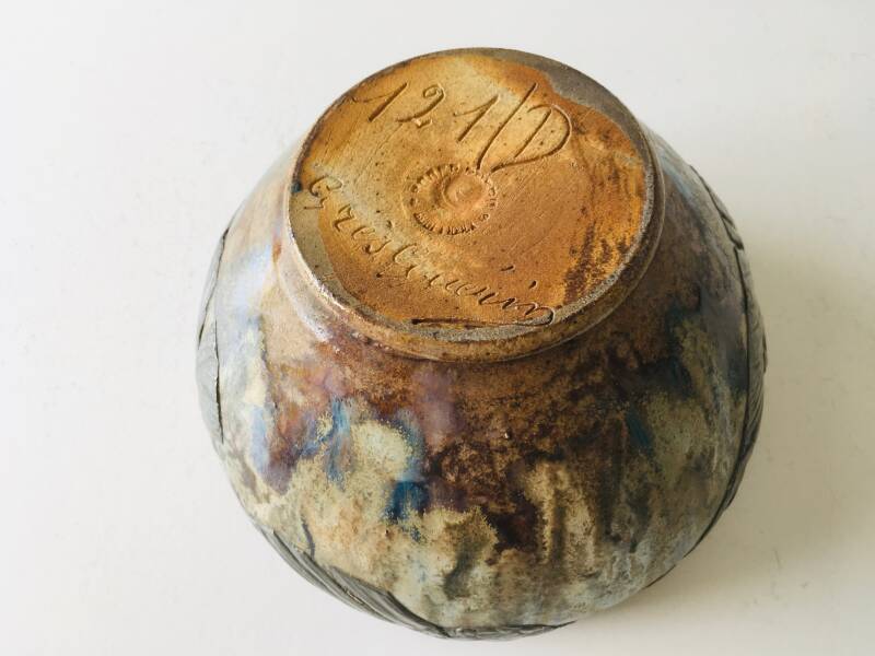 Art deco lid pot, 1920s, with tin application (13 cm h. without and 15 cm with lid, c. 20.5 cm wide), marked 121/D and signed "Grès Guérin", with stamp "Roger Guérin Bouffioulx". The same model but without tin is depicted in "Sel et feu. Les grès d'art de Bouffioulx et de Châtelet de 1900 to 1960" by Marianne Fauconnier & Jean-Claude Migeot (1995), p. 119, no. 358.